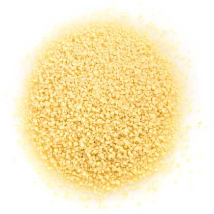 Couscous is made from two different sizes of the husked and crushed, but unground, semolina of hard wheat using water to bind them. When hard wheat is ground, the endosperm—the floury part of the grain—is cracked into its two parts, the surrounding aleurone with its proteins and mineral salts and the central floury mass, also called the endosperm, which contains the gluten protein that gives hard wheat its unique properties for making couscous and pasta.